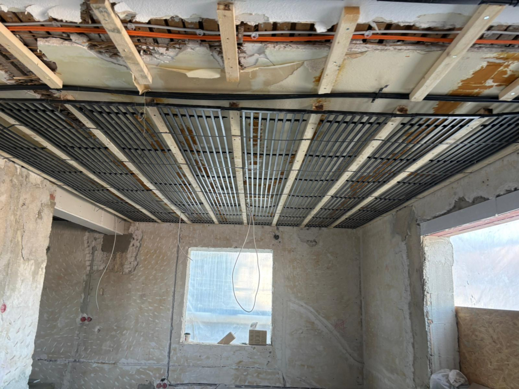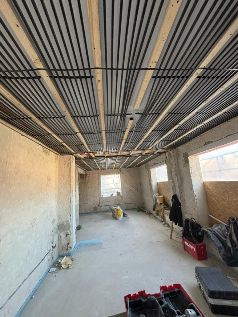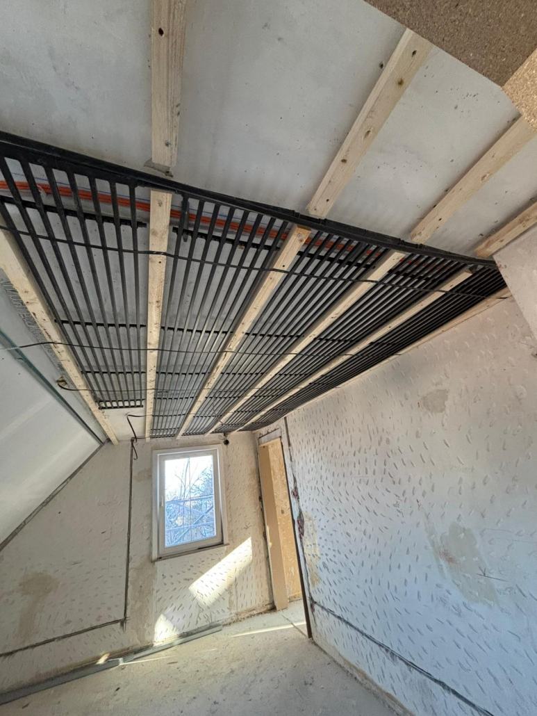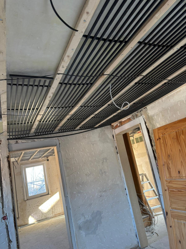 Besonderes Augenmerk lag auf dem Wohnkomfort. Daher wurde das Gebäude sowohl mit einer Fußboden- als auch mit einer Deckenheizung ausgestattet. Diese Kombination schafft ein angenehmes Raumklima zu jeder Jahreszeit, da die Wärme gleichmäßig verteilt wird und keine störenden Heizkörper mehr notwendig sind. Gleichzeitig ermöglicht das System im Sommer eine sanfte und energieeffiziente Kühlung, ohne dass zusätzliche Klimageräte erforderlich sind.