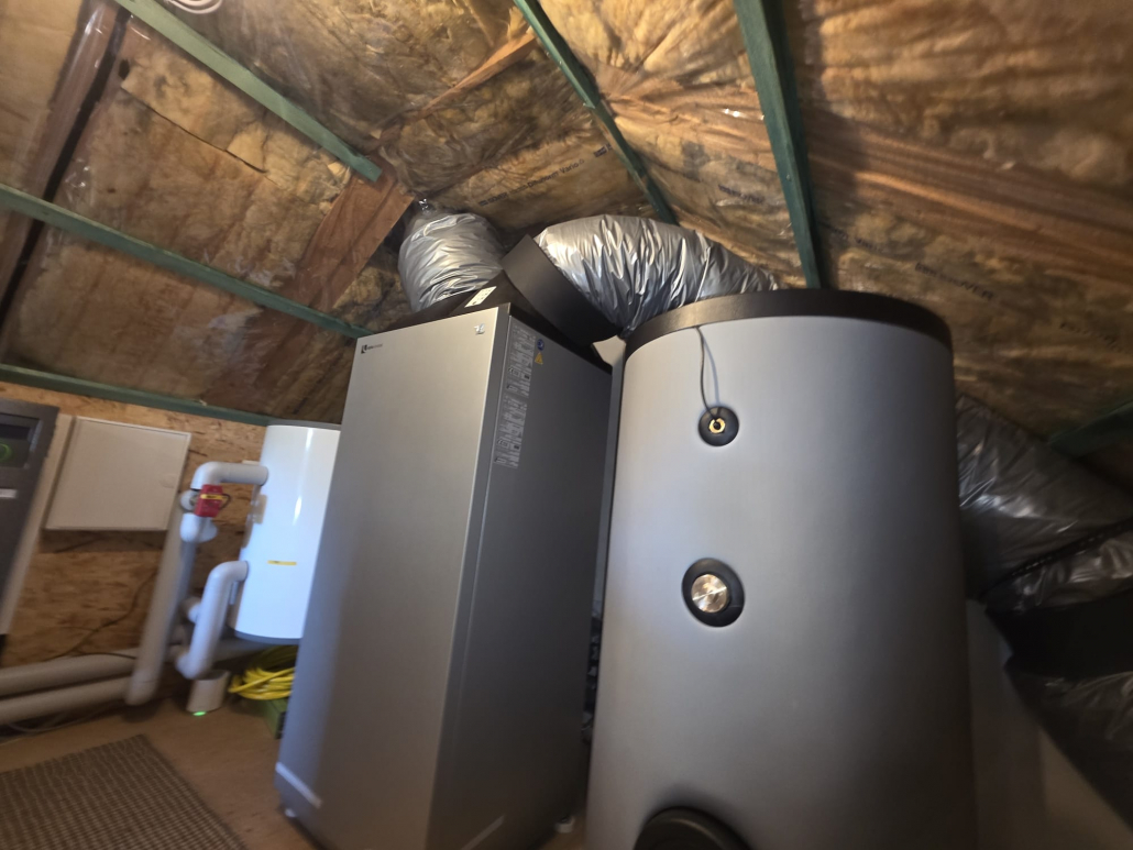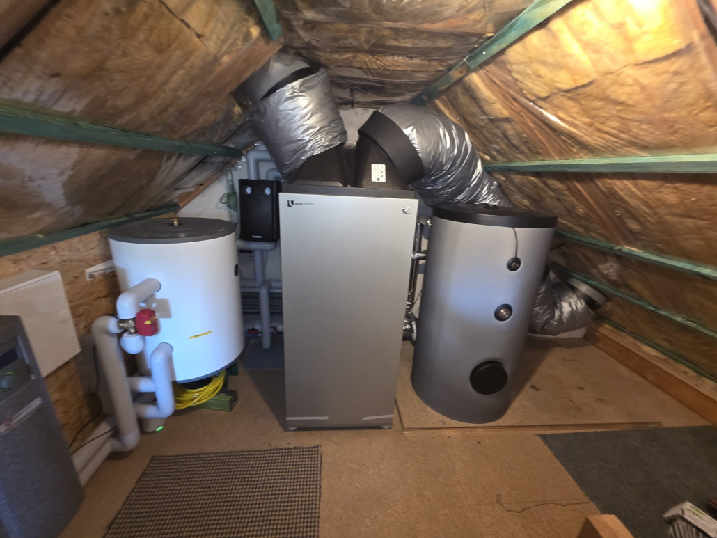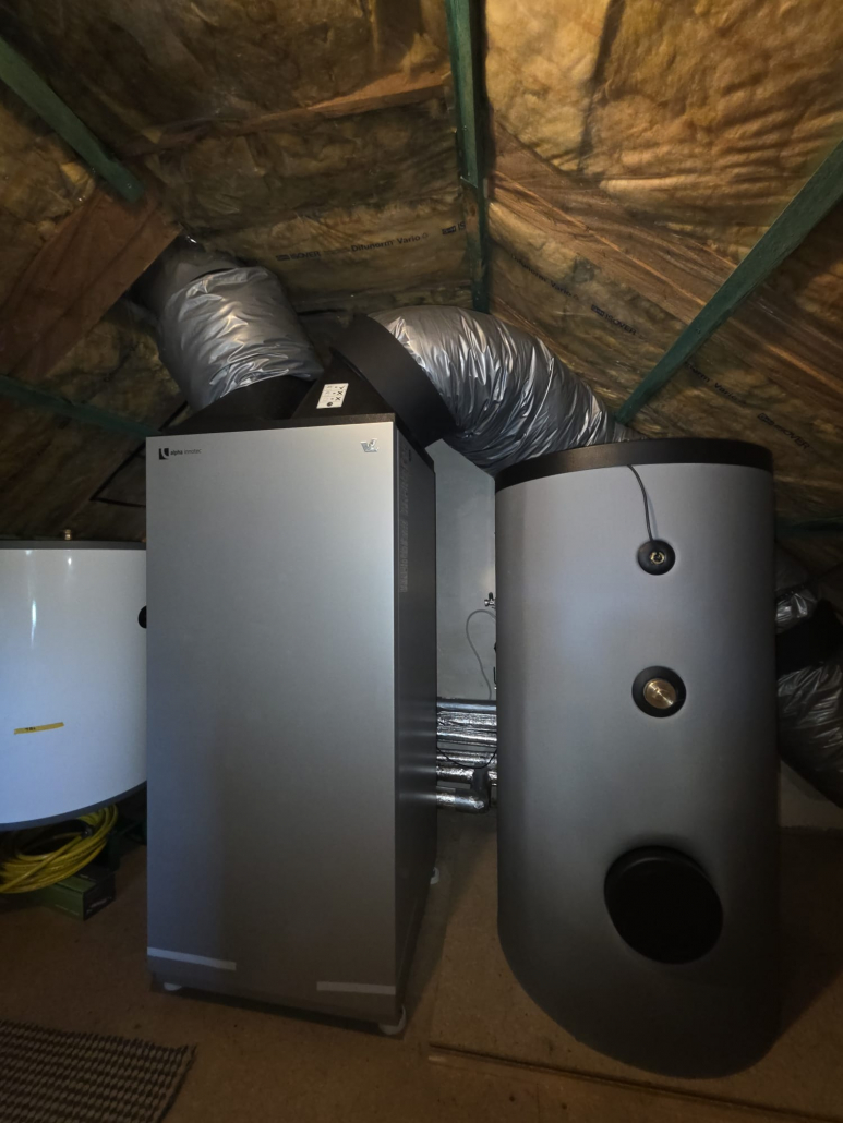 Bei diesem Bauvorhaben haben wir eine alpha innotec Paros Wärmepumpe installiert und mit einem separaten Warmwasserspeicher kombiniert. Besonders hervorzuheben ist die platzsparende Aufstellung direkt unter dem Dach. Dadurch konnte ungenutzter Raum effizient genutzt werden, ohne dass wertvolle Wohn- oder Nutzfläche im Haus verloren ging.